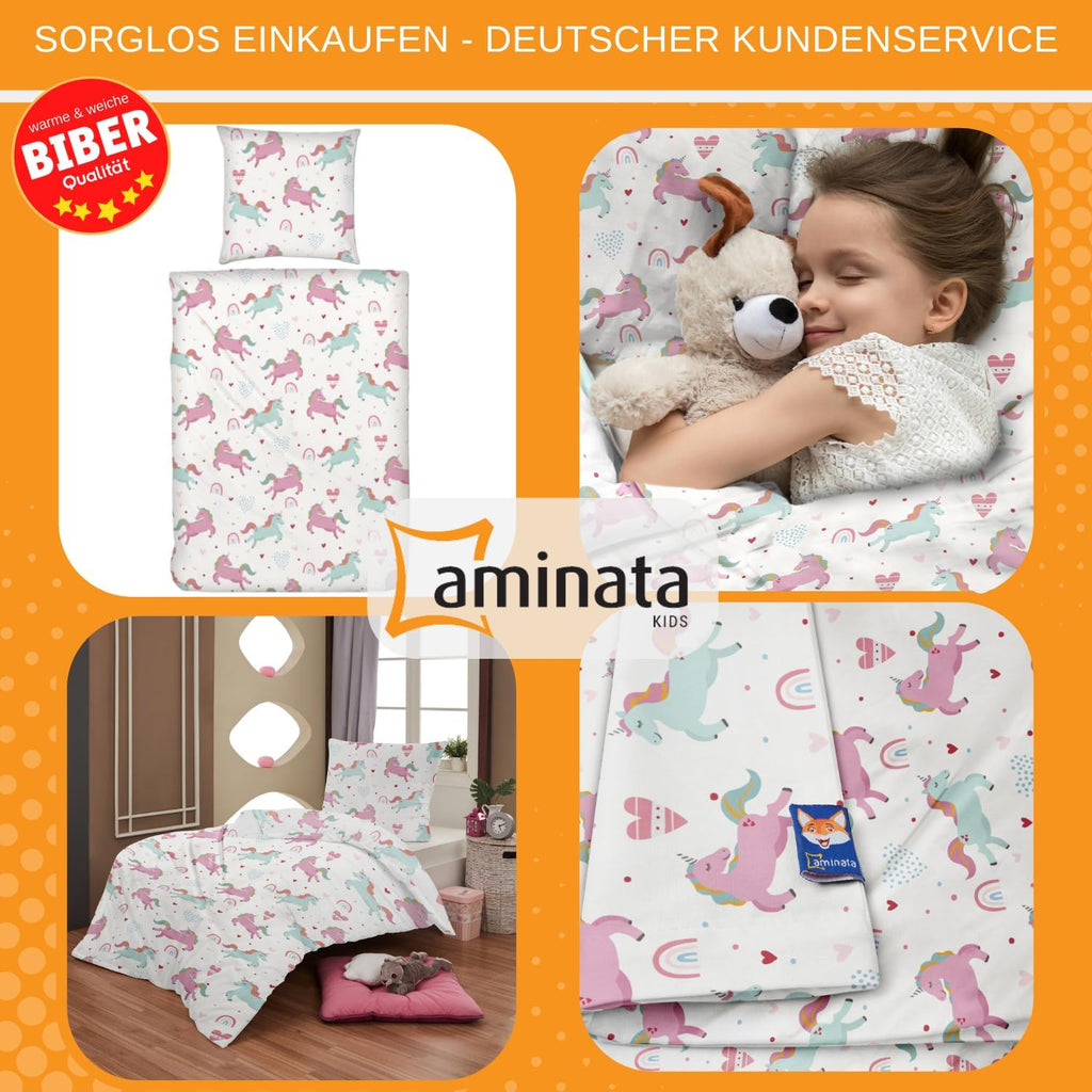Biber Bettwäsche Einhorn 135x200 | 80x80 cm - bunt - Baumwolle - Reißverschluss