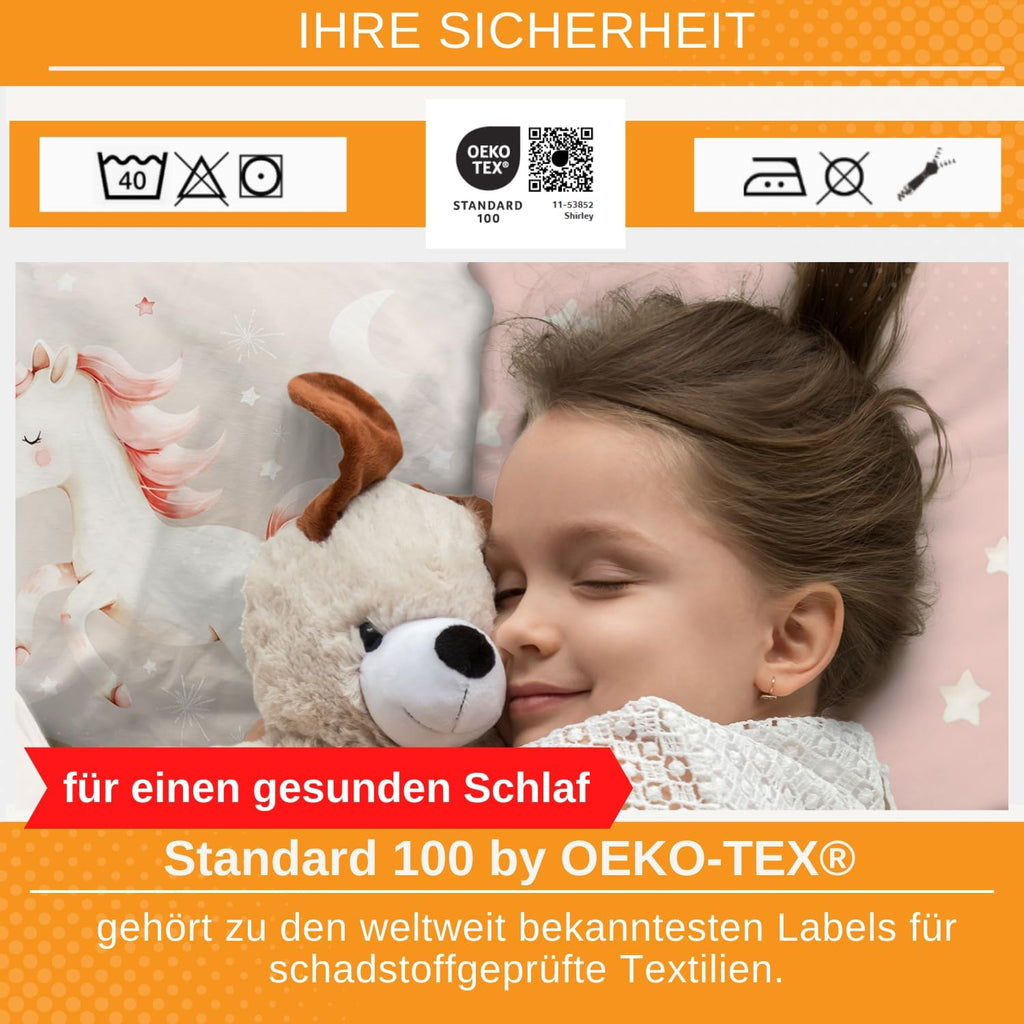 - ☁️ Baumwolle – ÖKO-TEX Zertifiziert: Unsere hochwertige Kinderbettwäsche besteht zu 100% aus Baumwolle (Renforcé), einem atmungsaktiven Material, das besonders hautsympathisch ist. Sie ist OEKO-TEX STANDARD 100 zertifiziert (PK 11-53852 Shirley), schadstoffgeprüft und bietet optimalen Schlafkomfort für sensible Kinderhaut.
