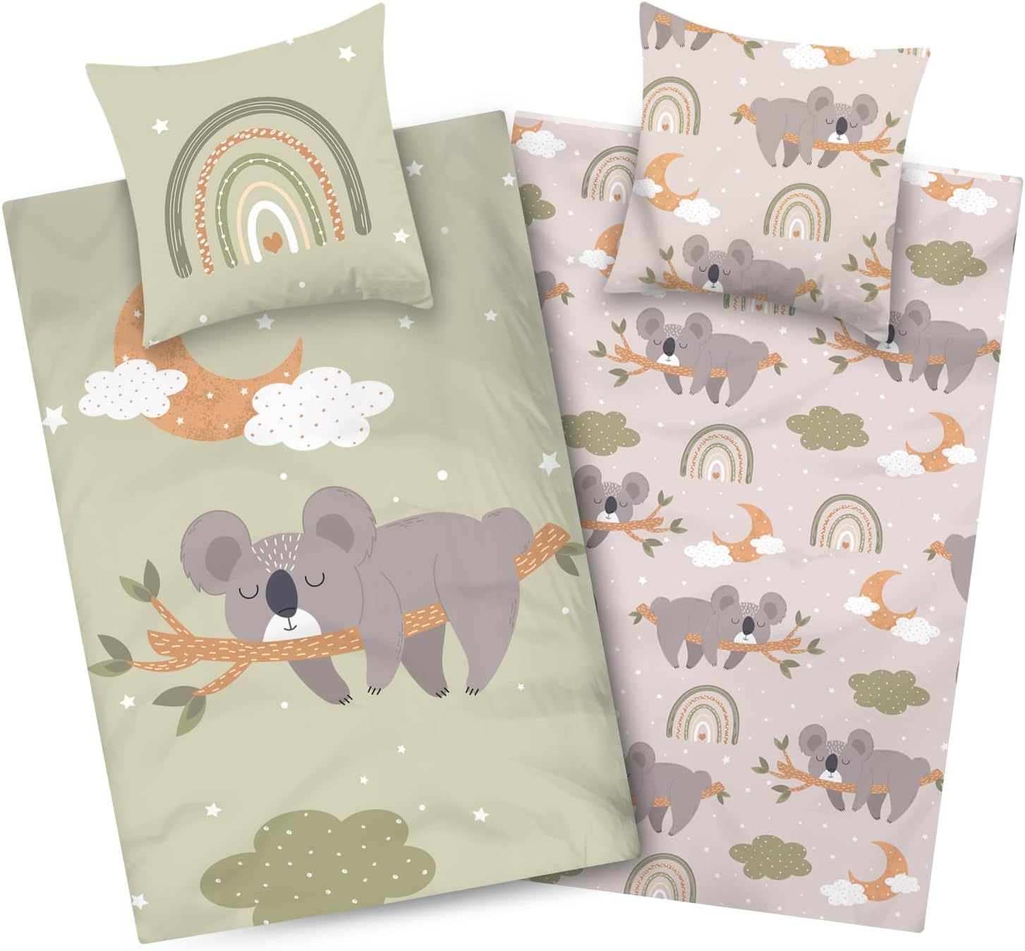 - ❤️ Zauberhafte Koala Bettwäsche: Dieses Kinderbettwäsche-Set (1x 135x200 cm Bettbezug mit Wendemotiv, 1x 80x80 cm Kissenbezug) lässt dein Kind von Koalas, Regenbögen und Wolken träumen. Eine märchenhafte Schlaflandschaft für kleine Prinzessinnen – die ideale Geschenk-Idee!