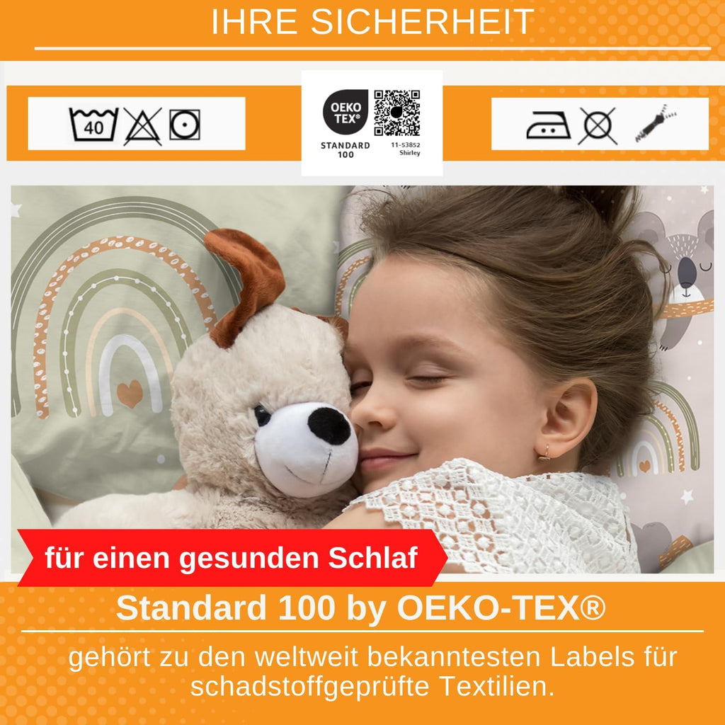 - ☁️ Baumwolle – ÖKO-TEX Zertifiziert: Unsere hochwertige Kinderbettwäsche besteht zu 100% aus Baumwolle (Renforcé), einem atmungsaktiven Material, das besonders hautsympathisch ist. Sie ist OEKO-TEX STANDARD 100 zertifiziert (PK 11-53852 Shirley), schadstoffgeprüft und bietet optimalen Schlafkomfort für sensible Kinderhaut.